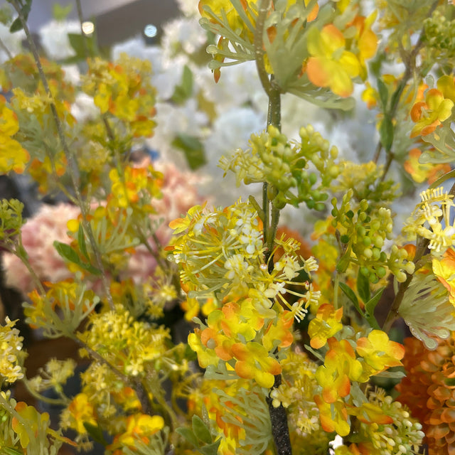Brighten up your space with this Large Yellow Blossom Spray Stem, designed with a beautiful mix of silk and plastic flowers for a realistic finish. The wired, shapable stem makes it easy to bend, style, and arrange, whether displayed alone or combined with other artificial flowers and foliage to create a show-stopping arrangement.