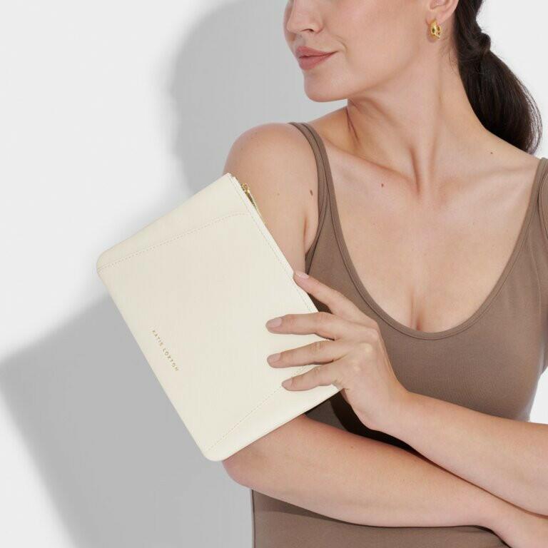 Welcome the Hana Pouch in Ecru to your new season wardrobe. This sleek and minimal design showcases a supple vegan leather material with our signature Katie Loxton gold-tone branded hardware. The pouch comprises of a main inner compartment, secured by a zip-top closure, ensuring the safe storage of small essentials, complemented by recycled lining.
