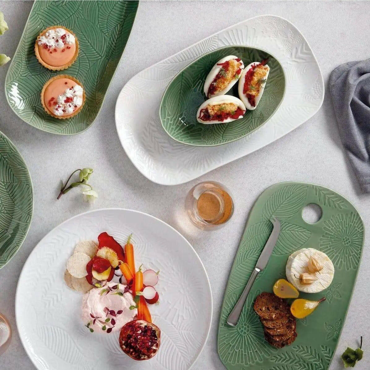 Stunning on its own, and breath-taking with other Panama pieces, this large serving platter will be the crowning glory of your dinner party or special meal. The wide expanse of white stoneware showcases its embossed foliage, lending textural and visual appeal to your table. As a serving dish, coloured sushi or rich antipasti will pop against its white backdrop. As a decorative piece, it will add understated beauty to a corner of your home.