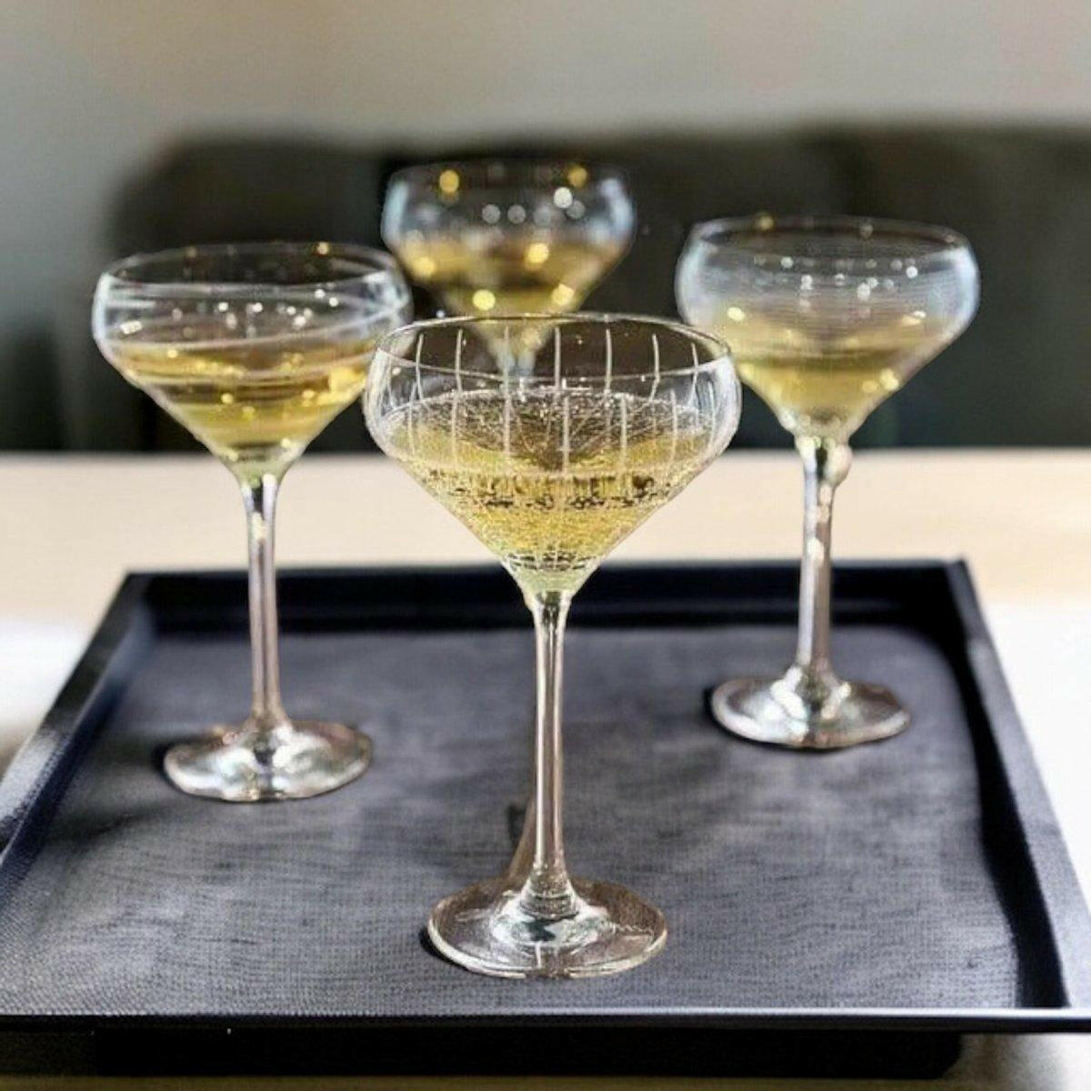 These beautiful Mikasa Cheers Champagne Saucers are sold as set of four and each has individual designs.