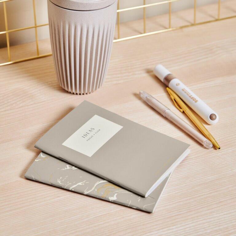 Our Duo Notebook Set in Light Taupe includes two slim notebooks with soft PU covers: one featuring the inspiring sentiment 'Ideas Focus Flow', and the other adorned with a beautiful marble print design. Perfect for elevating your workspace.