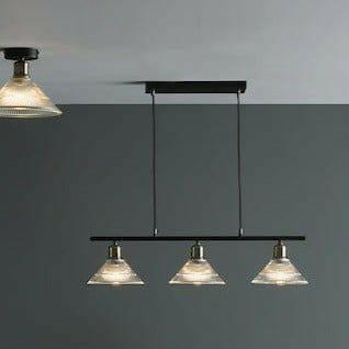 The prismatic shade offers an industrial style reminiscent of old factory lighting. The 3 light bar format lends its self to hanging over a long table or breakfast bar. Featuring 1m of black braided cable that can be shortened on installation. The Boyd 3 light bar pendant is suitable for sloped ceilings.