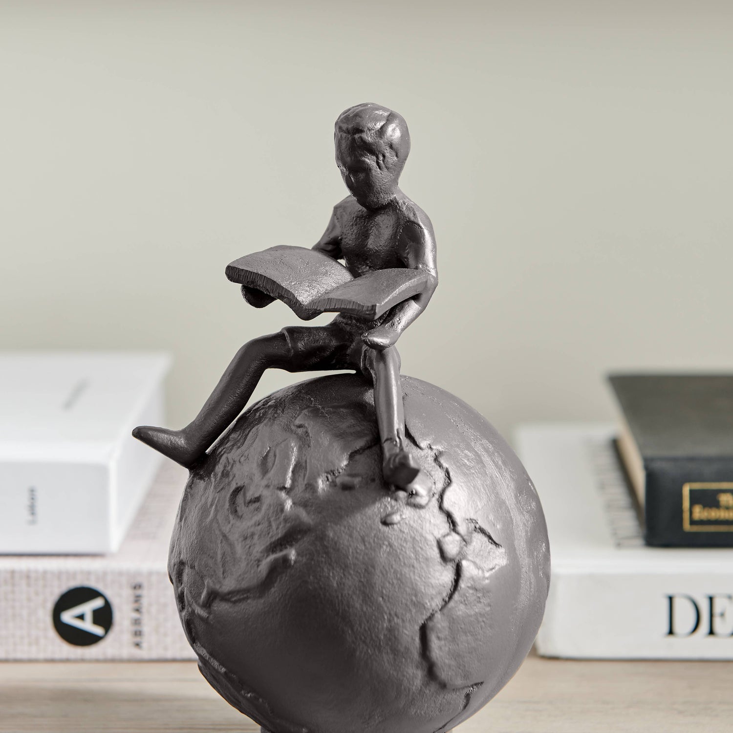 Brown Cast Iron Boy Reading on Globe Sculpture