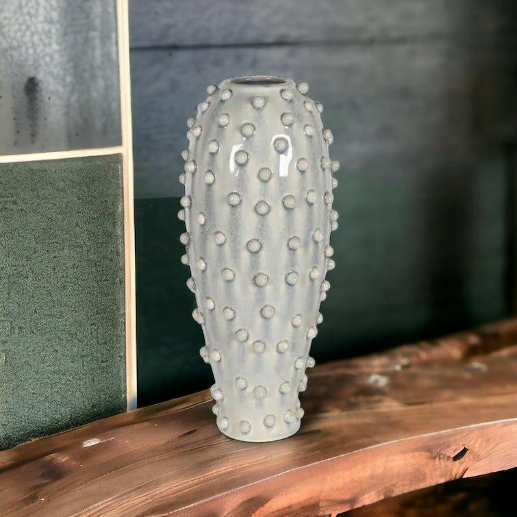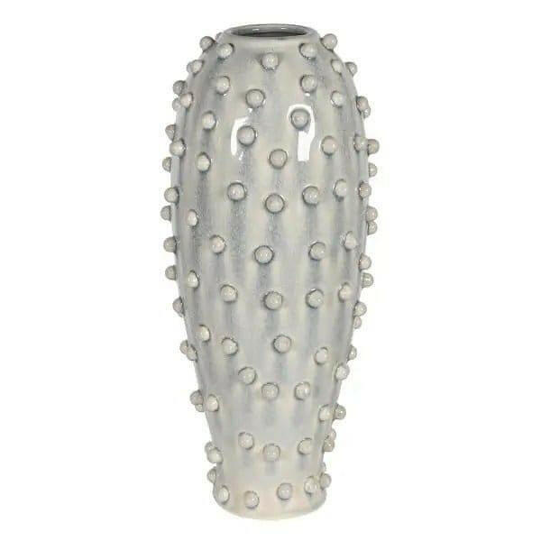 The unique bobble design of this tall grey vase adds a touch of texture, while the blue grey color provides a modern, neutral palette.