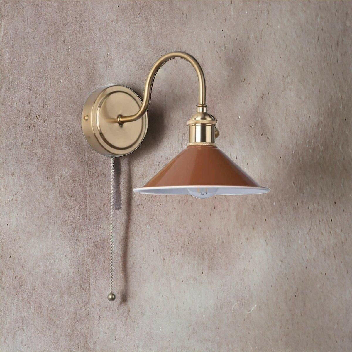 This all-metal version has a vintage-look cone shade of spun steel, finished in an earthy burnt umber with a white inner. The colour is complemented by the sophisticated natural brass finish wall plate, lamp holder and chain pull (which can easily be removed if not required).