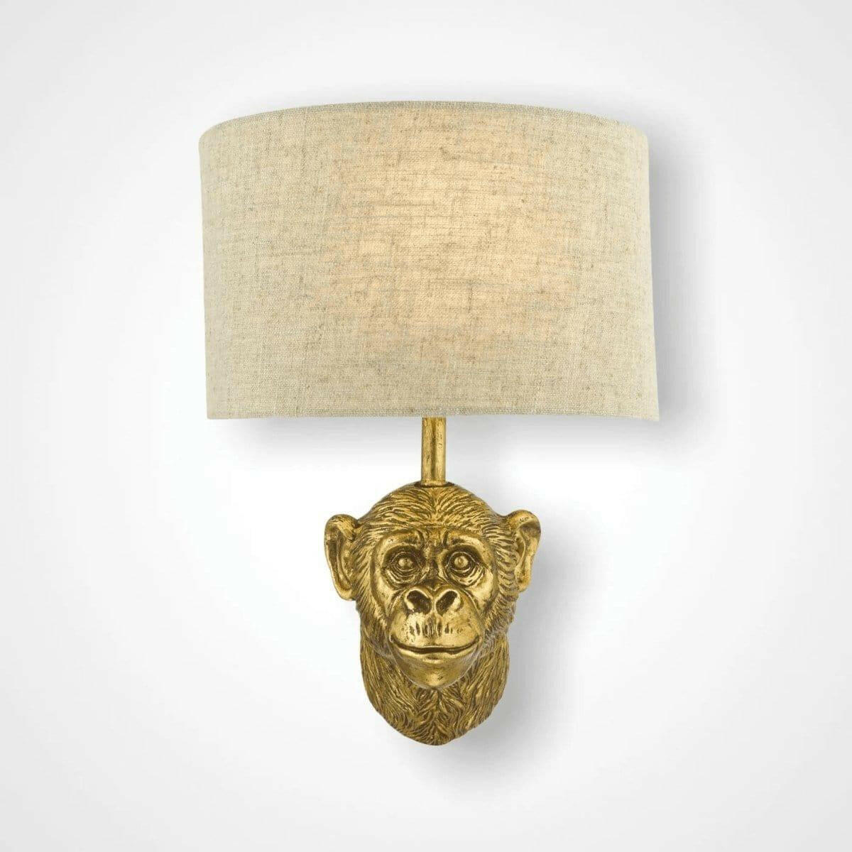 The Raul monkey wall light In a gold leaf finish with a dark wash to show the intricate details, finished with a natural linen shade. This curious monkey wall light joins his other friends Ruri the leopard, Sophie the giraffe and Abbey the Zebra.