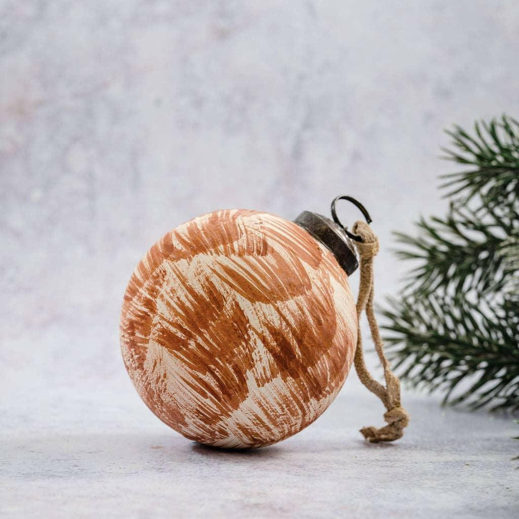 A hand-blown glass bauble, dipped in Plaster of Paris, and a hand-finished with a brushed paint design. This is a chalky, matt finished bauble, and very modern in design.