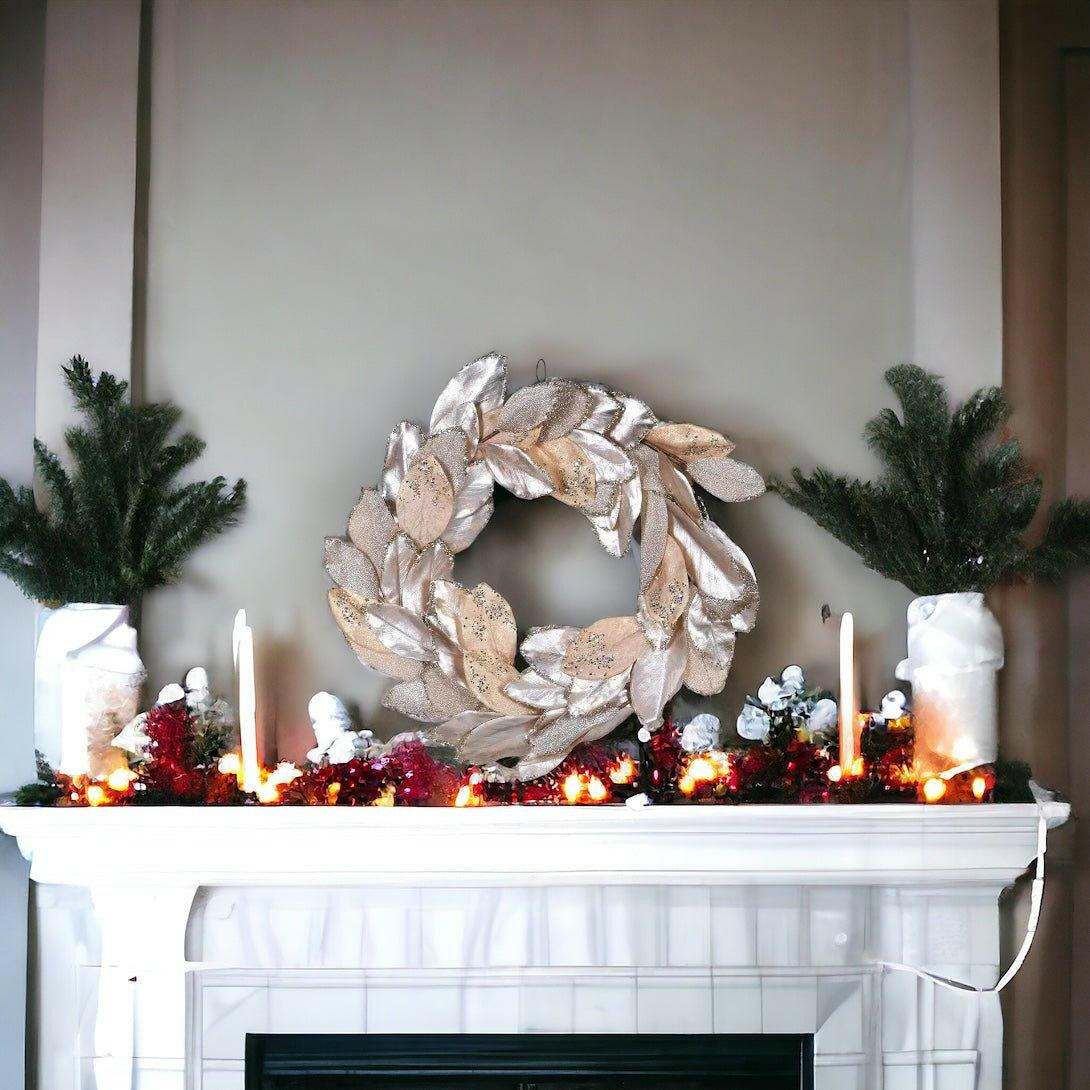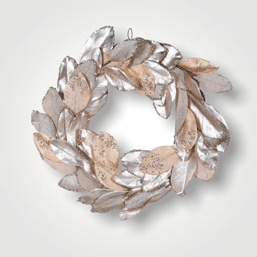 Make a lasting festive impression with our gorgeous champagne gold magnolia leaves Christmas wreath. At 60cm in diameter, this Christmas wreath features a stunning winter collection of frosted foliage for a traditional festive look to greet your guests.