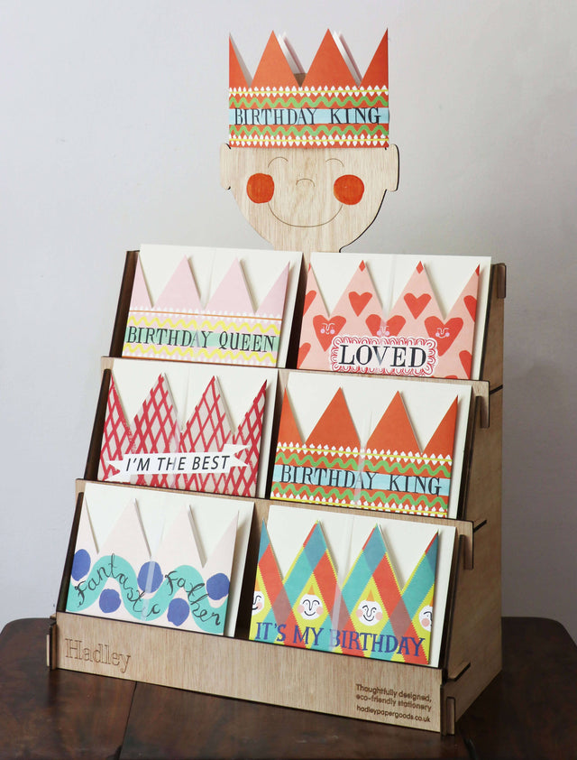 The Hadley Hat Stand! A bespoke wooden stand lovingly designed by Jo to display the Party Hat Cards in a unique and eye-catching way. Made exclusively for our Wholesale customers, this fun display stand can create a focal point for customers to browse your Hadley card collection in all it's glory! A bright and quirky stand to catch your customers' attention and elevate sales.